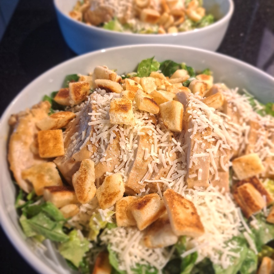 Caesar Salad – natürlich mit selbstgerösteten Croutons und Huhn dazu.