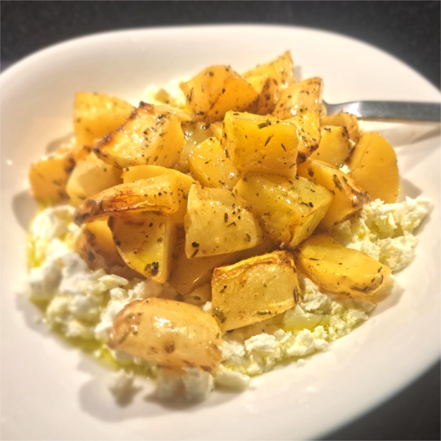 Zitronenkartoffeln aus dem Backofen mit Feta-Joghurt.