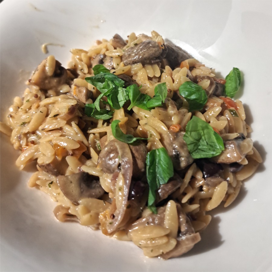 Orzotto mit Miso-Pilzen. Nicht schlecht. (Überhaupt hat „Kochen ohne Kohle“ oft gute Ideen!)