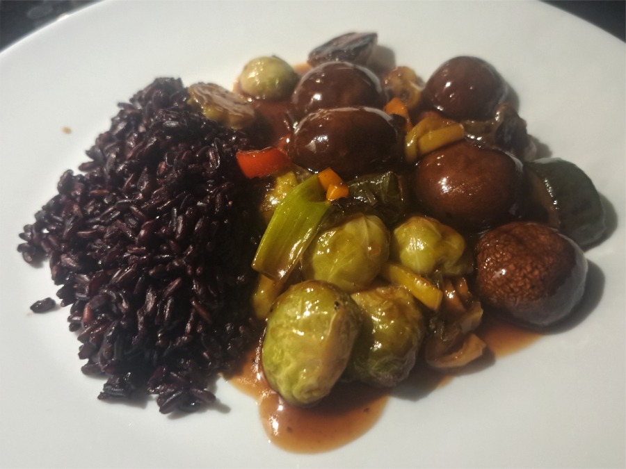 Frisches Restgemüse, im Backofen gegart und in einer Teriyaki-Sauce, dazu schwarzer Reis.