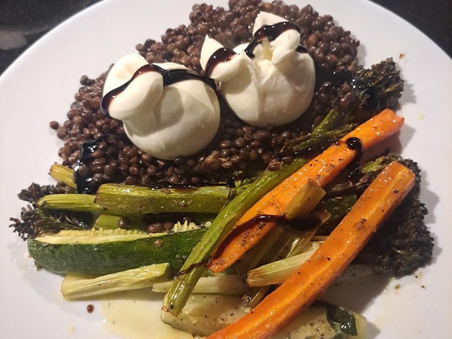 Mini-Burrata auf Linsen, dazu Möhren, Zucchini, Bimi und Lauchzwiebeln aus dem Backofen.