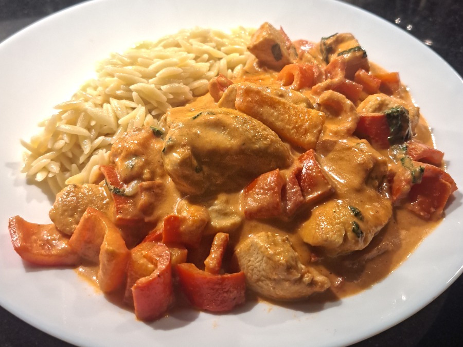 Hähnchenbrustfilet mit Paprika in einer Frischkäsesauce, dazu Risoni.