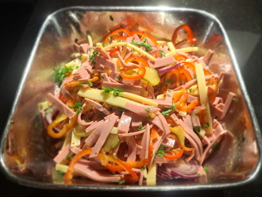 Käse-Wurstsalat – mein übliches Rezept, aber mit Emmentaler dazu.