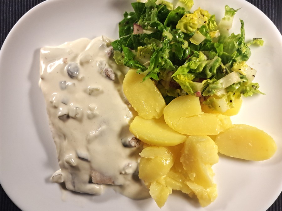 Sahne-Heringe, Kartoffeln und grüner Salat.