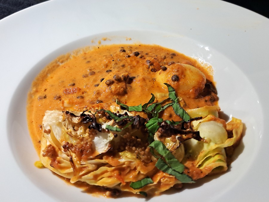 Ofen-Spitzkohl auf Linsen und Tomatensauce. Sehr fein, gibt’s wieder…