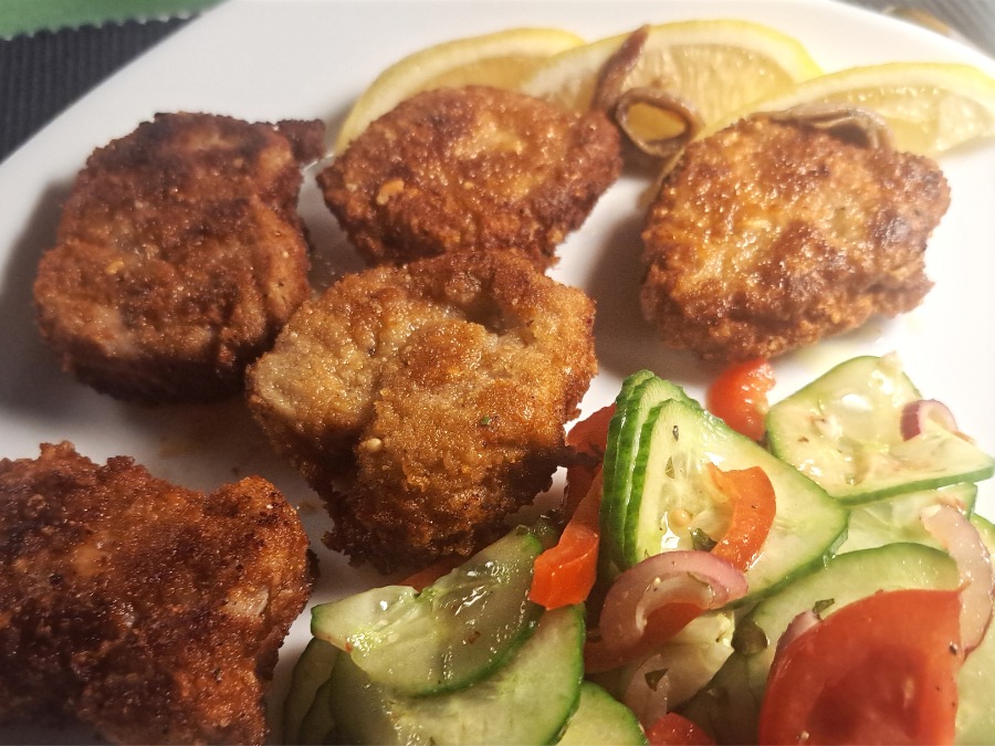 Eine geniale Idee: „Wiener“ Schnitzelchen aus Schweinefilet, sonst wie sonst… (Ca. 2 cm dick schneiden, zärtlich plattklopfen.)