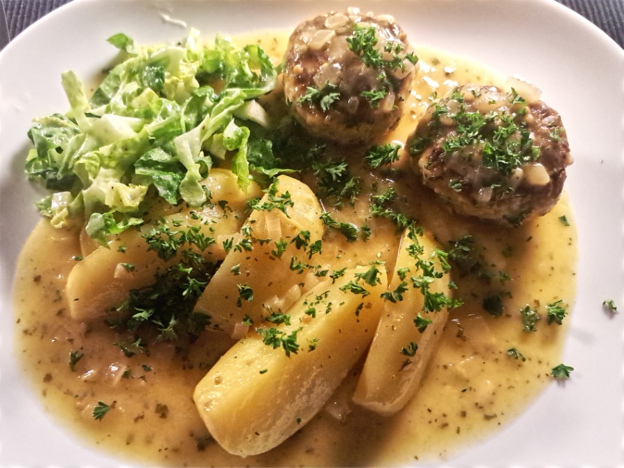 Frikadellen aus Geflügelhack mit einer sehr zitronigen Sauce, dazu Kartoffeln und Feldsalat. Yummie!
