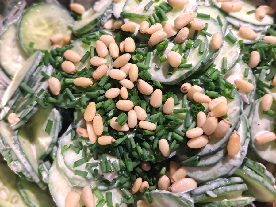 Hackbällchen-Pasta-Auflauf und Gurkensalat – wer die Bällchen besser sehen will, muss weniger Käse drüberstreuen. 😉