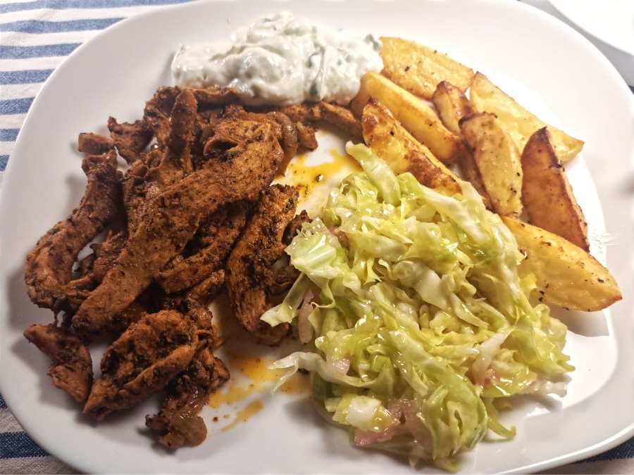 Beinahe-Gyros (mariniertes und gebratenes Putenfleisch) mit Ofen-Kartoffeln, Krautsalat und Satziki. Jo, das war lecker.